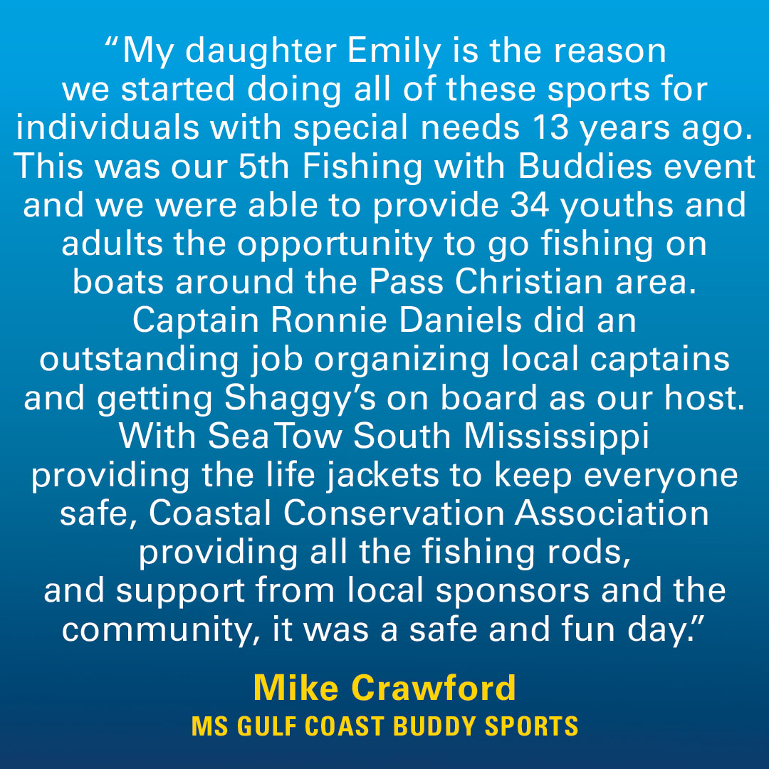 MISSISSIPPI -Sea Tow South Mississippi has been providing life jackets from their loaner stations twice a year to Fishing with Buddies, and the event is growing every year. Organized by MS Gulf Coast Buddy Sports, 34 participants with special needs had a safe day fishing while boating out on the water. Hosted by Shaggy’s, with additional support from Granny's Alliance, Coastal Conservation Association (CCA), the City of Pass Christian, Department of Marine Resources, all the wonderful captains organized by Captain Ronnie, and volunteers, they were able to provide this event free of charge. Posted November 18, 2022
